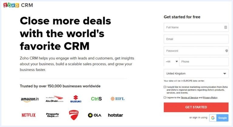 For instance, let’s see what makes Zoho CRM’s landing page a true conversion bomb.