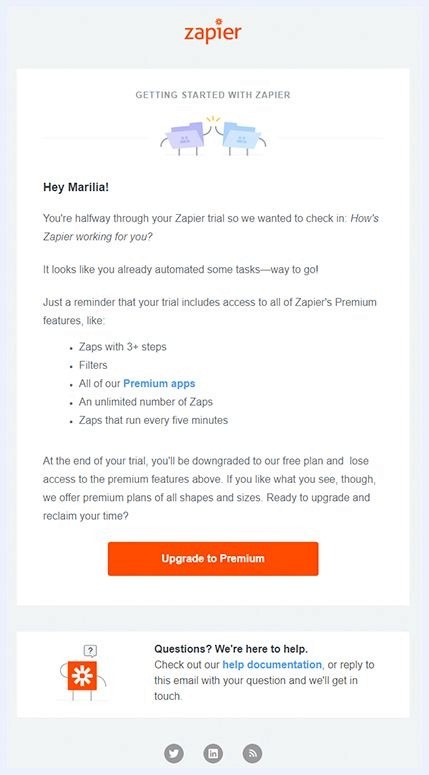 Zapier’s premium trial email campaign is a prime example of a lead nurturing tactic that shows the user why they need the premium version.