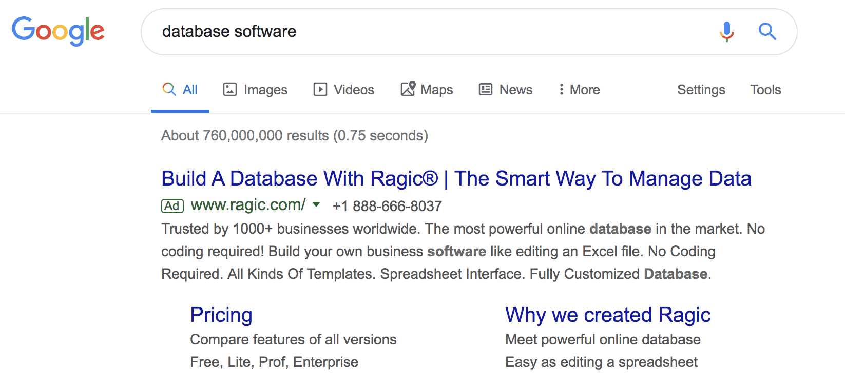 You’ll notice Ragic utilize paraphrases of the search query. They have actionable ad copy with strong social proof that makes you much more likely to click through. The only thing missing is the word ‘software’ in the headline.