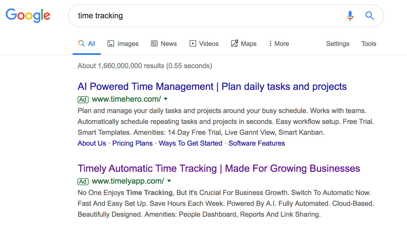 The second ad from Timely uses the exact keyword we’ve searched for (‘time tracking’). We’re automatically recognizing the intent and taking them into consideration.