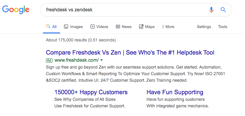 You’d include the keyword in the headline. In this example you can see the keyword was ‘Freshdesk vs Zendesk’ and this is reflected in the headline.