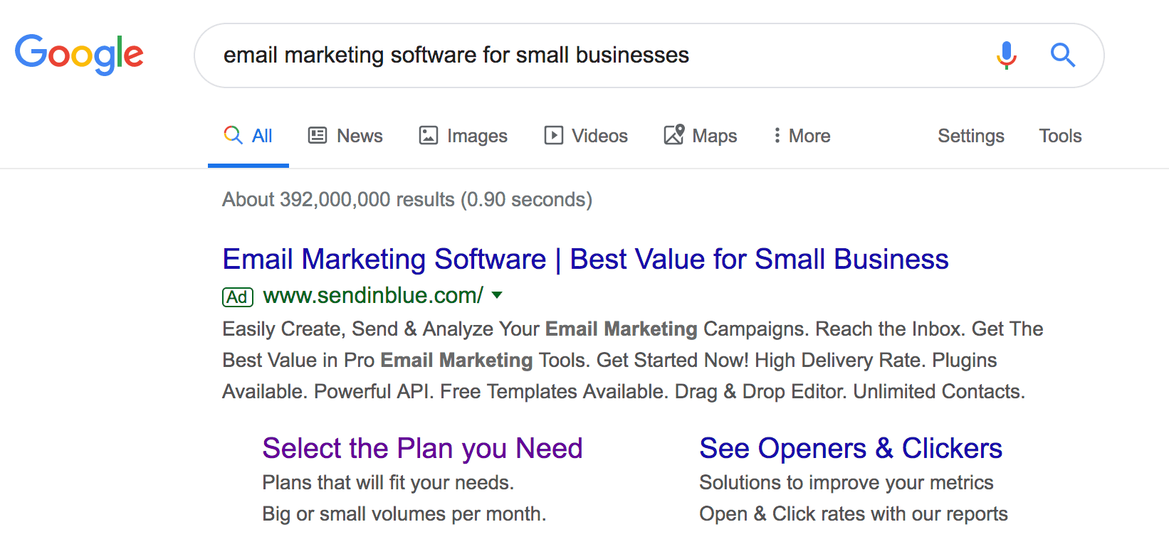 Just consider this ad, which appears when we search for ‘email marketing software for small businesses:’