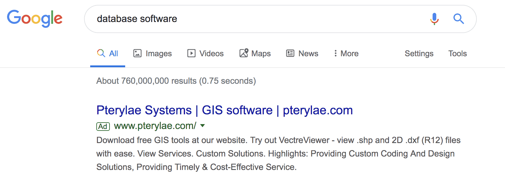 Pterylae don’t mention ‘database’ in the headline or copy and in general, the ad copy doesn’t in any way trigger an emotional response from the searcher. If you then go through to look at the Pterylae website you’ll see that this ad isn’t relevant for the search term and it’s highly unlikely a searcher will spend much time on this page. This will result in a low quality score.