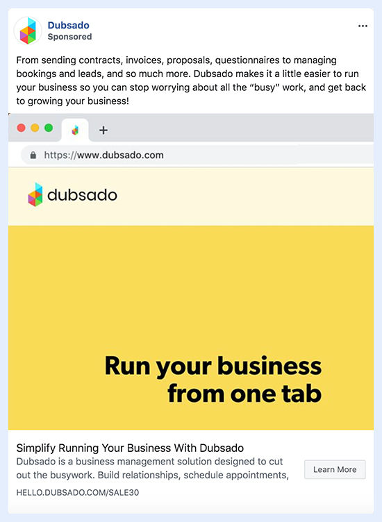 Create a landing page with a CTA, even for your brand awareness ads. Dubsado use a generic ‘Learn More,’ so you get bonus points if you ask your viewers to take action.