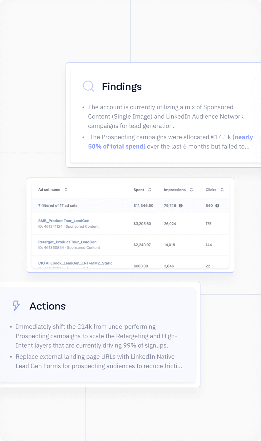 We audit the existing setup, whether that's an imported Google account, an underperforming Bing account, or no Microsoft Ads presence at all, against how B2B SaaS buying works on Microsoft's network.