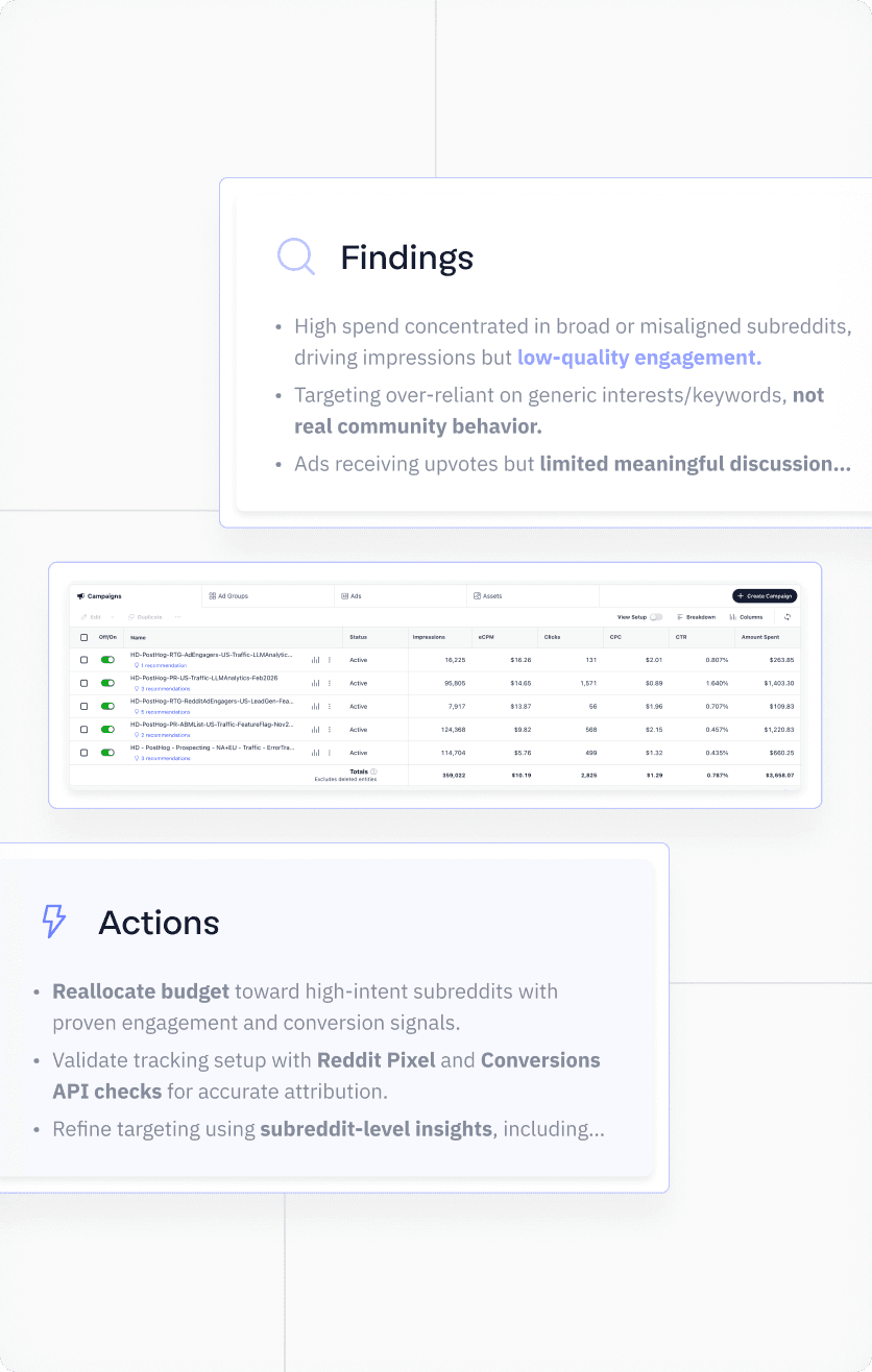 We run Reddit ad campaigns for B2B SaaS companies — and we write the creative that actually works on the platform. Not repurposed LinkedIn ads. Reddit-native campaigns built by a team that understands how Redditors think and what earns their attention.