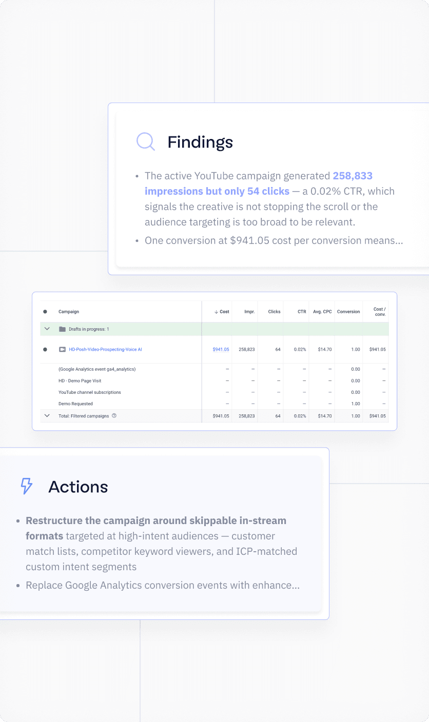 Our writers, designers, and video producers create every ad that runs on your account. UGC scripts, motion graphics, product demos, bumper cuts, Shorts variations. New creative every sprint. When you're paying $0.03-$0.15 per view, the video is the variable that determines whether that view becomes pipeline or waste.
